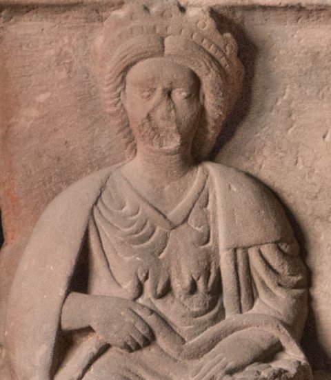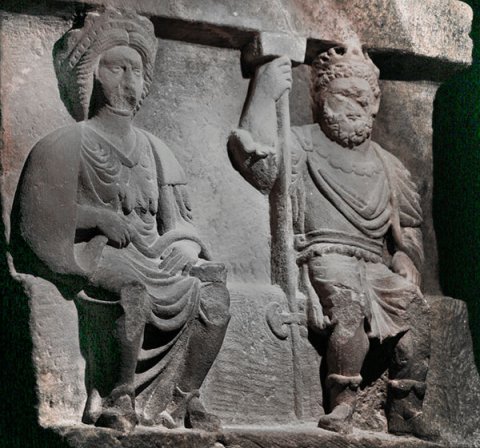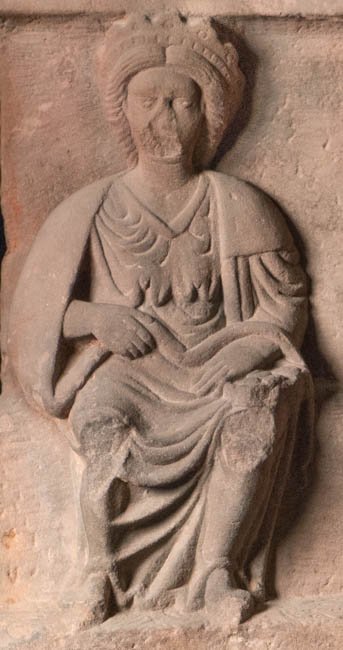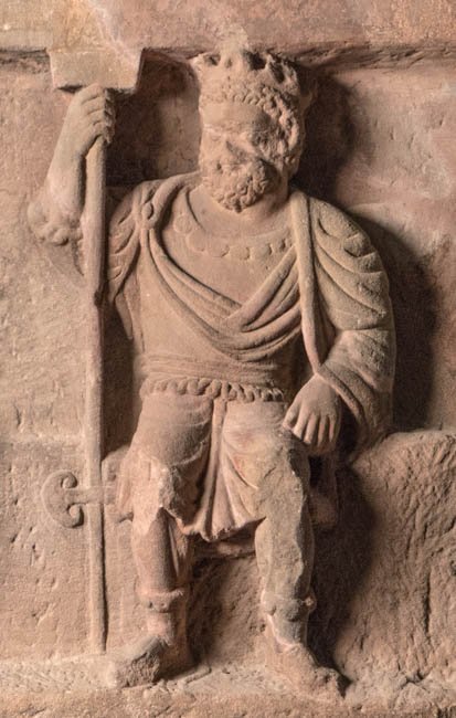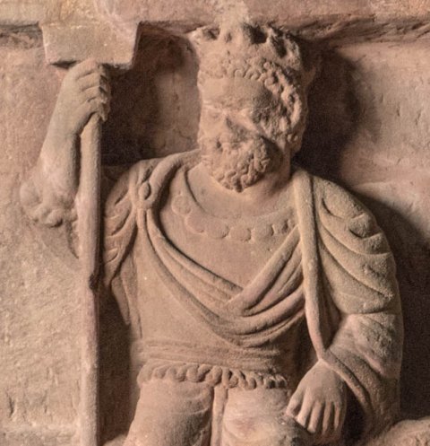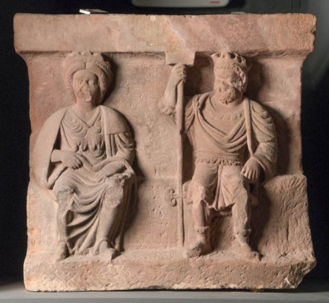 - Mythische Figuren: Thronendes Götterpaar. Links Nantosuelta in Chiton und Mantel, auf dem Kopf gezacktes Diadem, auf dem linken Knie Früchte. Rechts bärtiger Sucellus in kurzer Tunica, Brustpanzer, Mantel und Stiefeln, auf dem Kopf Krone, in der rechten langer Stab, darauf oben Hammer, unten Doppelaxt. Ungerahmte Platte mit vorspringenden Randleisten oben und unten.