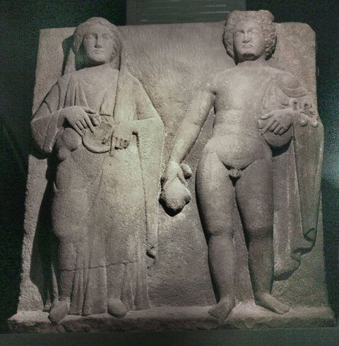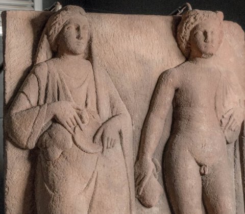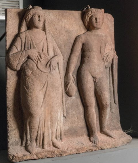 - Mythische Figuren: ungerahmte Platte mit vorspringender Standleiste, stehendes Götterpaar. Links Rosmerta in Ärmelgewand und über den Kopf gezogenem Mantel, in der Rechten Geldbeutel, in der Linken Schale. Rechts Mercus mit Flügelkappe, nackt bis auf Mantel über dem linken Arm. In der Rechten Geldbeutel, im linken Arm Caduceus.