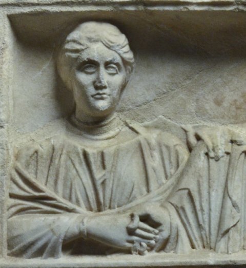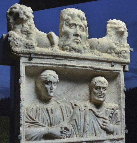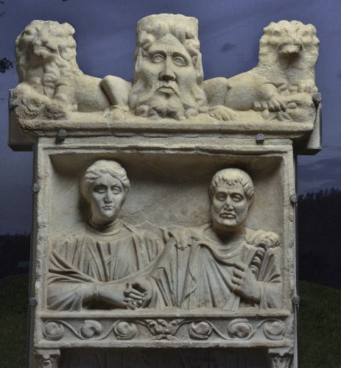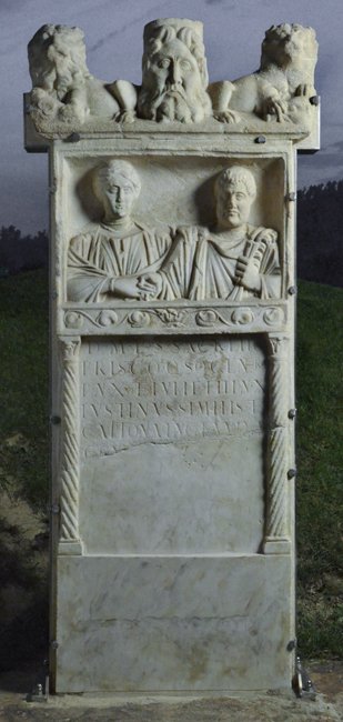 Als Bekrönung bärtiger Kopf mit Polos zwischen liegenden Löwen mit Tierschädeln unter den Vorderpranken. Im Hauptbild zwei Brustbilder (Ehepaar). Links Frau in Tunica und Mantel, am rechten Arm Armband. Rechts bärtiger Mann in Ärmeltunica, Sagum mit Fransen und Scheibenfibel, Fingerring, in der Linken Rolle (volumen).