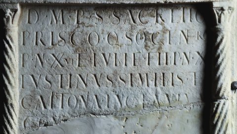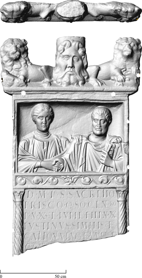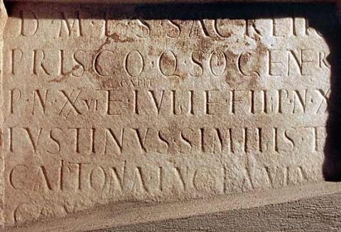 - D(is) M(anibus) p(ositum) S(exto) Sacretio / Prisco Q(uirina) Sol(va) genero / p(ientissimo) an(norum) XXVI et Capit(oniae) Iuli(a)e fil(iae) p(ientissimae) an(norum) XX / Iustinus Similis et / Capitonia Ingenuina / con(iuges) [---] / [---