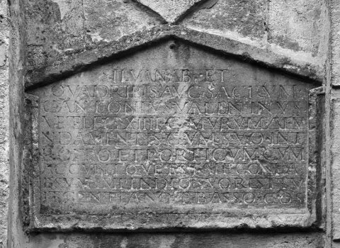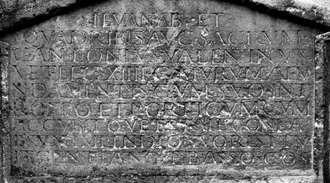 - Silvanab(us!) et / Quadri<v=B>is Aug(ustis) sacrum / C(aius) Antonius Valentinus / vet(eranus) leg(ionis) XIIII G(eminae) murum a fu/ndamentis cum suo int/roito et porticum cum / accubito vetustate conla/bsum impendio suo restitu/it Gentiano et Basso co(n)s(ulibus)