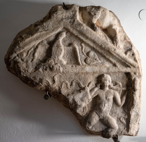 - Auf den Giebelschrägen liegende Löwen. Im Giebel Adler mit ausgebreiteten Flügeln zwischen Efeublättern. Im Hauptbild Girlande, von geflügelten Genien getragen.