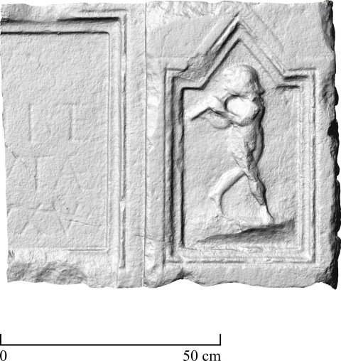 1381 Fragment einer Grabinschrift mit Satyrrelief