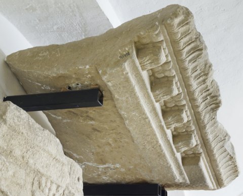 - Teil der rechten Dachschräge mit Konsolgesims am Rand, darüber Sima mit Pfeifenstab.
