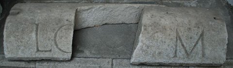 - 2 Fragmente, Mittelteil rezent herausgebrochen u. verloren. In der Oberseite rechts u. links Klammerloch