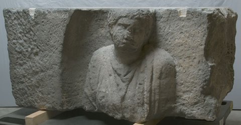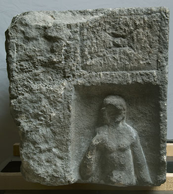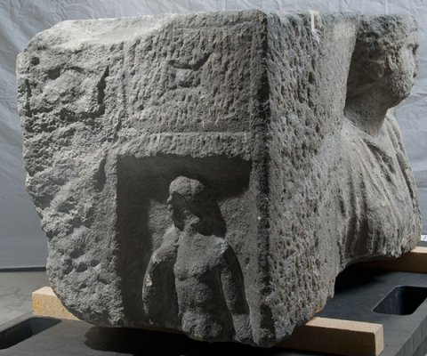 - Eckblock: auf der Vorderseite tiefe Bogennische (Rahmen vermutlich abgearbeitet), darin Oberkörper eines bärtigen Mannes in Tunica und Toga, auf der linken Nebenseite oben rechteckiges Feld mit Ornament, darunter hochrechteckige Nische mit stehender unbekleideter Frauenfigur (mythische Figur: Venus?).