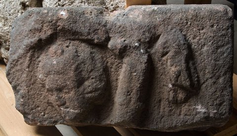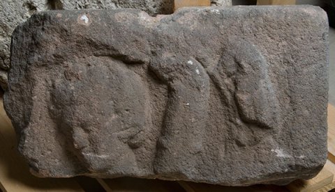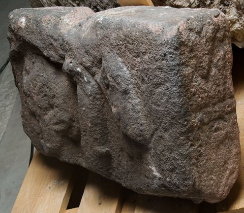 - Auf der Vorderseite (vermutlich linke Nebenseite des Blockes) Kopf einer Frau mit erhobenem linken Arm (mythische Figur: tanzende Mänade). Reif um den Oberarm, hinter dem Kopf Schleier. Auf der rechts anschließenden Seite heute nur ornamentierte (Blattkandelaber ?) Rahmenleiste erhalten, früher noch Reste einer Frau (vermutlich Vorderseite des Blocks mit Porträtfigur).