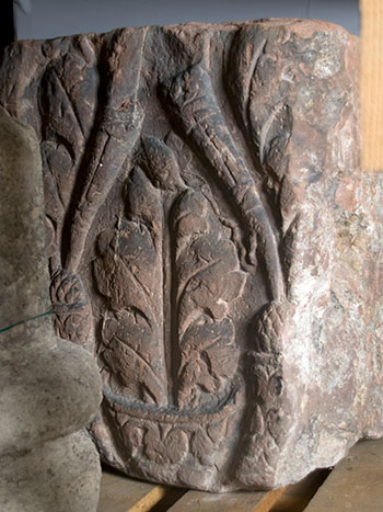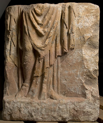 - Block mit Relief auf Vorder- und Rückseite. Vorn mythische Figur: stehende Fortuna in Chiton und Mantel, neben dem rechten Bein Reste eines Steuerruders. Auf der Rückseite mit Blattkranz verzierte Schale, aus der Akanthus wächst. Auf dessen Spitze Vogel mit kleiner Schlange im Schnabel. Seitlich der Schale Füllhörner mit Pinienzapfen und Akanthusstängel. Fragment eines Votivaltars ?