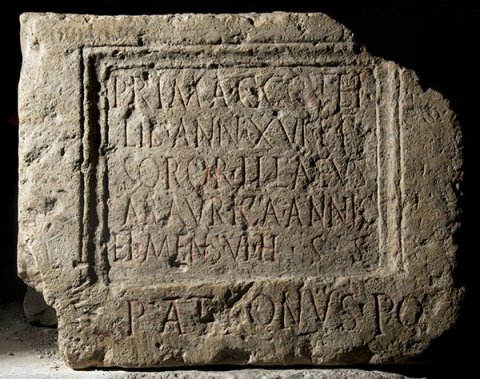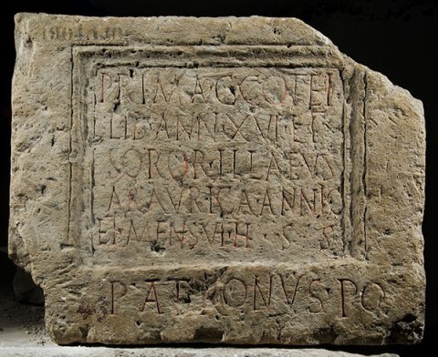 - Prima C(ai) Cotei / lib(erta) ann(orum) XVI et / soror illaeus(!) / Araurica annic(ula) / et mens(ium) VI h(ic) s(itae) s(unt) / patronus po(suit)