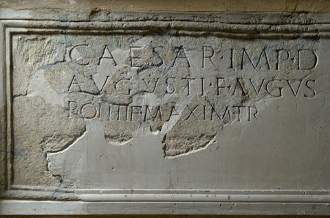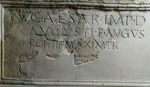 - [[Ti(berius)?]] Caesar [I]mp(erator) d[ivi] / Augusti f(ilius) Augu[stus] / pontif(ex) maxim(us) t[rib(unicia) pot(estate) ---] / [[[------]]] / [------]
