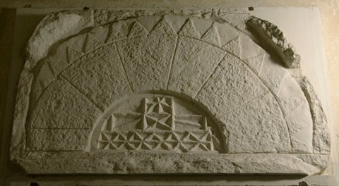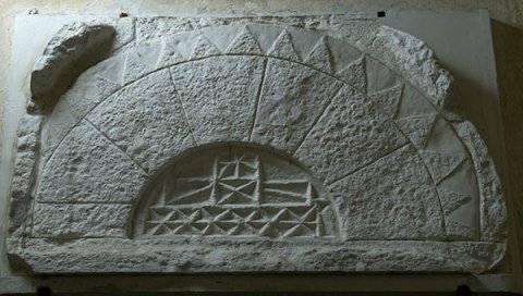 - Bogenrahmen mit Zackenfries, breite Zone mit Quaderimitation, kleines Bogenfeld mit Kerbschnitt-Dekor.