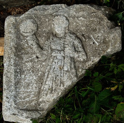 - Dienerin: in Rechteckfeld einheimisches Mädchen mit gegürtetem Obergewand mit Fibeln, in der Rechten Spiegel, über der linken Schulter mappa.