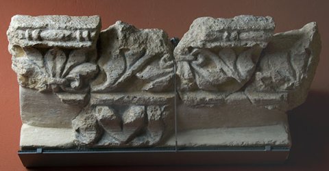 - rechte Gesimsecke: unten einfaches Blattkyma, darüber Palmettenfries und Perlstab