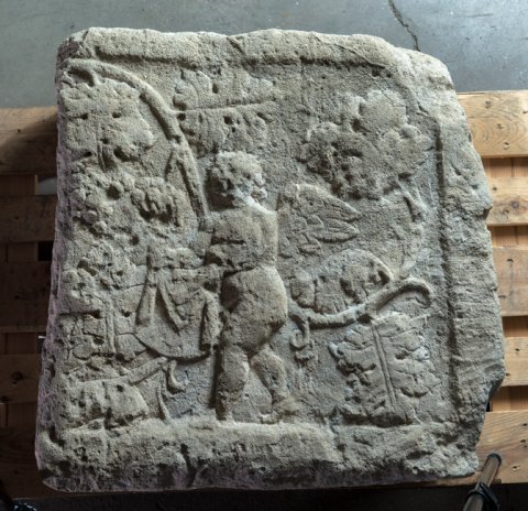 - Rechteckiges Bildfeld mit Weinranken und Erot, der ein Tuch vor sich hält (Weinlese ?).