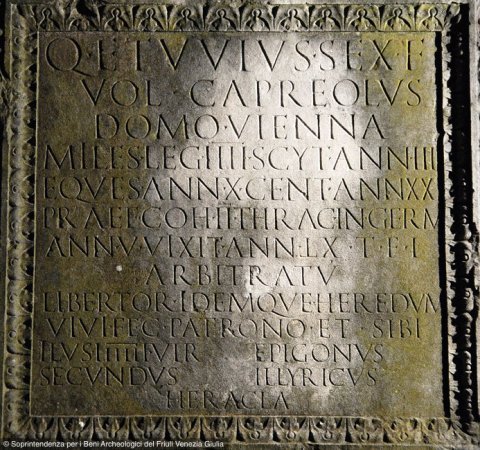- Q(uintus) Etuvius Sex(ti) f(ilius) / Vol(tinia) Capreolus / domo Vienna / miles leg(ionis) IIII Scyt(hicae) ann(os) IIII / eques ann(os) X cent(urio) ann(os) XXI / praef(ectus) coh(ortis) II Thrac(um) in Germ(ania) / ann(os) V vixit ann(os) LX t(estamento) f(ieri) i(ussit) / arbitratu / libertor(um) idemq(ue) heredum / vivi fec(erunt) patrono et sibi // Ilus IIIIIIvir / Secundus // Epigonus / Illyricus // Heracla
