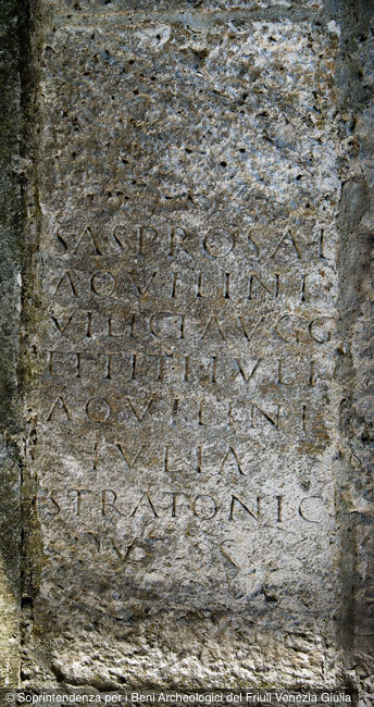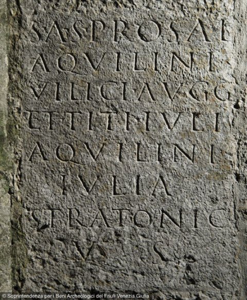- S(pei) A(ugusto) s(acrum) pro sal(ute) / Aquilini / vilici Augg(ustorum) / et Ti(beri) Iuli / Aquilini / Iulia / Stratonic(e) / v(otum) s(olvit)