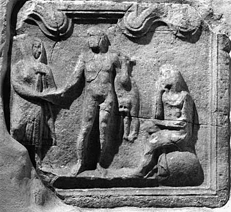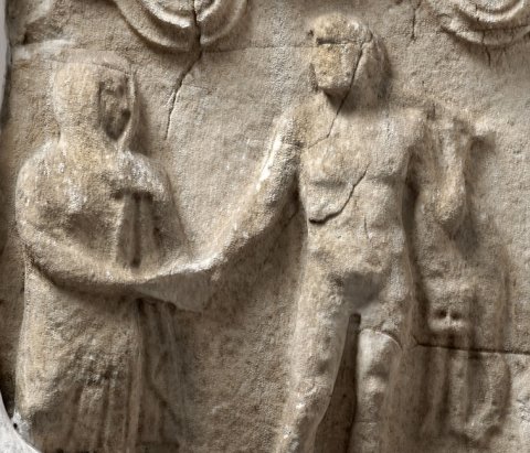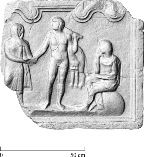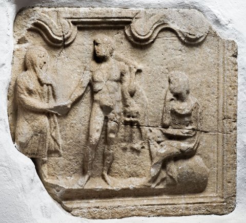 - Mythos: in Feld mit geschwungenem oberen Rahmen rechts sitzender Admet, vor ihm Herakles-Hercules: Löwenfell über dem linken Arm, Keule geschultert, fasst mit der Rechten die Rechte der verschleierten Alkestis.