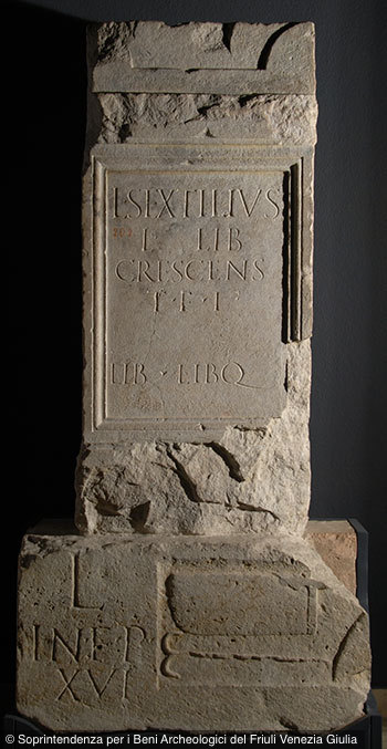 - L(ucius) Sextilius / L(uci) l(ibertus) / Crescens / t(estamento) f(ieri) i(ussit) / lib(ertis) lib(ertabus)q(ue) // L(ocus) [m(onumenti)] / in f(ronte) p(edes) XVI