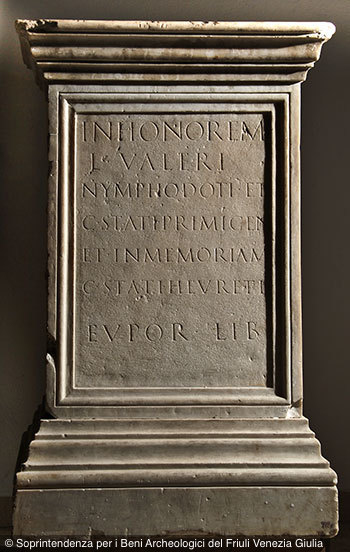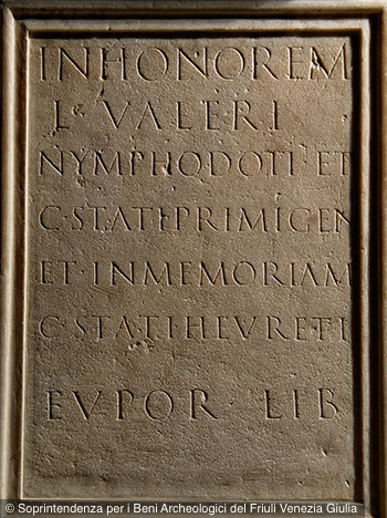 - In honorem / L(uci) Valeri / Nymphodoti et / C(ai) Stati Primigeni / et in memoriam / C(ai) Stati Heureti / Eupor lib(ertus)