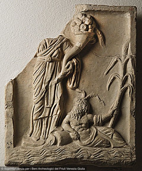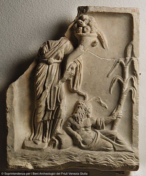 - Mythische Figuren: Stadtgöttin (Tyche von Aquileia) mit Füllhorn, gelagerter Flussgott (Natissa ?) mit Schildfstängel, auf Wassergefäß gelehnt, unten Wellen.