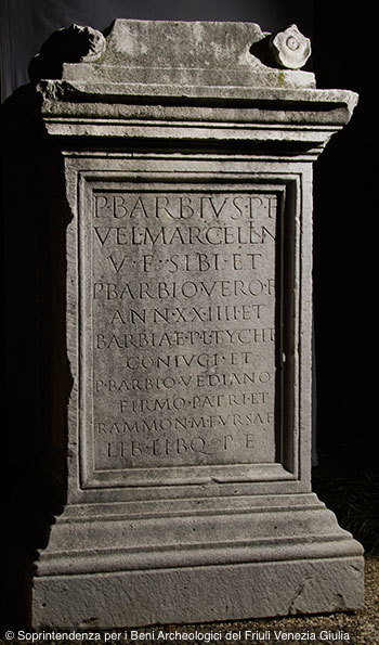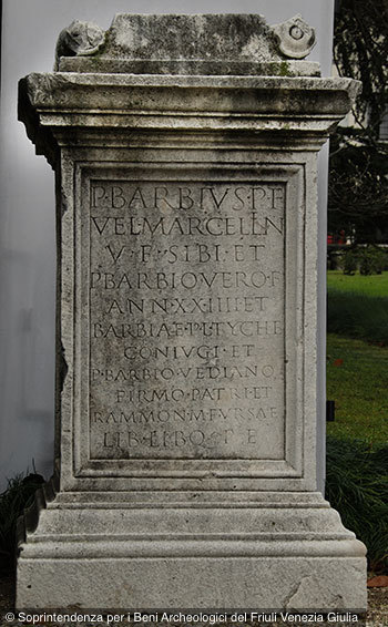 - P(ublius) Barbius P(ubli) f(ilius) / Vel(ina) Marcellin(us) / v(ivus) f(ecit) sibi et / P(ublio) Barbo Vero f(ilio) / ann(orum) XXIIII et / Barbiae P(ubli) l(ibertae) Tyche / coniugi et / P(ublio) Barbio Vediano / Firmo patri et / Rammon(iae) M(arci) f(iliae) Ursae / lib(ertis) lib(ertabus)q(ue) p(osterisque) e(orum)