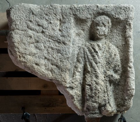 - Auf der Außenseite Trauergenius: zwischen Pilastern mit Blattornament nackter Knabe mit gesenkter Fackel. Auf der Innenseite Diener: leicht eingetieftes Rechteckfeld. Frontal stehender Mann in kurzer Tunica, über der linken Schulter mappa, in der Rechten Krug (?). Auf der Schmalseite vorn Blattornament.