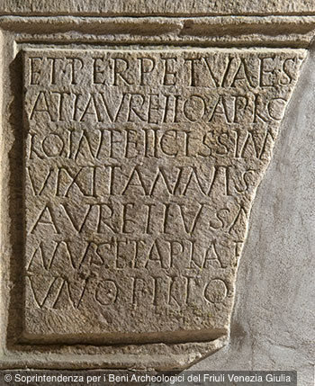 - D(is) M(anibus) / et perpetuae se[curit]/ati Aurelio Apro [fil]/io infelicissimo qui / vixit annis XVIIII / Aurelius Maximi/nus et Apra parentes / uno filio orbati