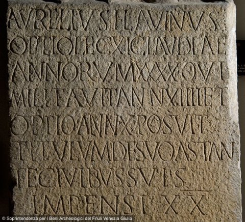 - D(is) M(anibus) // Aurelius Flavinus / optio leg(ionis) XI Claudiae / annorum XXXX qui / militavit ann(os) XIIII et / optio ann(os) X posuit / titulum de suo astan/te(!) civibus suis / impensi(!) XX(milibus)