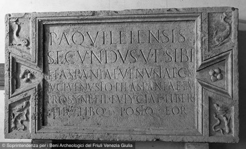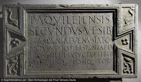 - P(ublius) Aquileiensis / Secundus v(ivus) f(ecit) sibi / et Aspaniae Venustae con/iugi Venusto f(ilio) Aspaniae Eu/prosyne fil(iae) Eutyciae liber(tae) / lib(ertis) lib(ertabus)q(ue) post(eris)q(ue) eor(um)