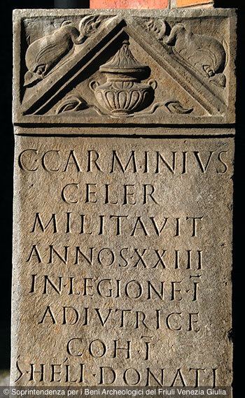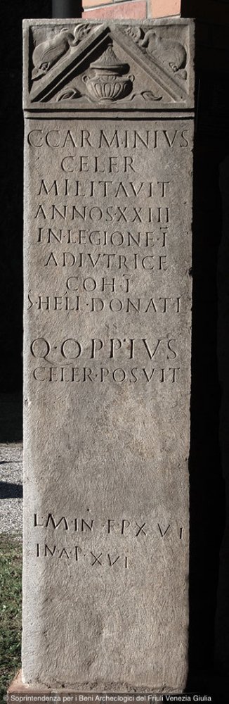- C(aius) Carminius / Celer / militavit / annos XXIII / in legione I / Adiutrice / coh(orte) I / |(centuria) Heli Donati / Q(uintus) Oppius / Celer posuit / l(ocus) m(onumenti) in fr(onte) p(edes) XVI / in a(gro) p(edes) XVI