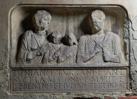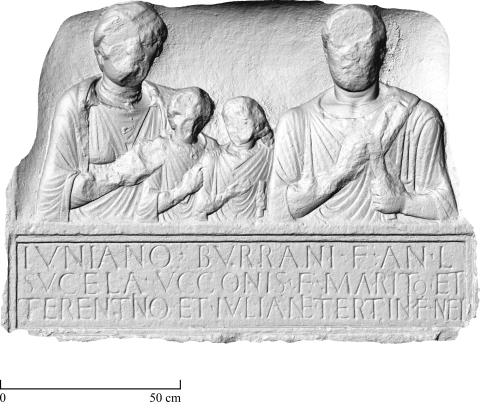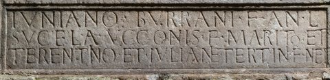 - Iuniano Burrani f(ilio) an(norum) L / Sucela Ucconis f(ilia) marito et / Terentino et Iulian(a)e Tertini f(iliae) nep(ti)