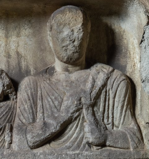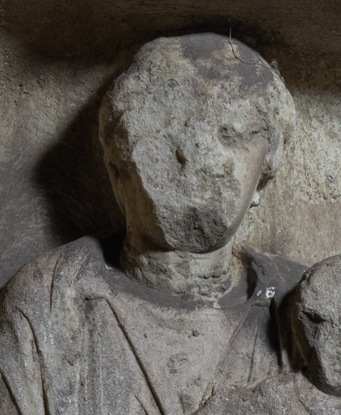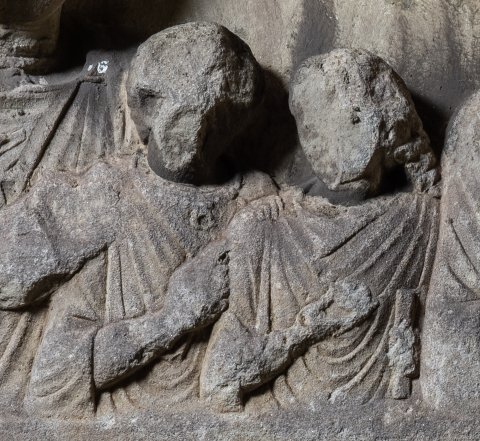 - Familie: in Rechteckfeld Brustbilder eines Ehepaares mit zwei Kindern. Links einheimische Frau: Haube, Umhang, Fibeln, Kniefibel als Brosche, Halskette, Halsreif mit Lunula. In der Mitte links Mädchen: Ärmeltunica, Halskette mit Lunula. Rechts Knabe: Horuslocke, Ärmeltunica, in der Rechten Apfel, in der Linken Rolle (volumen). Ganz rechts Mann: bärtig, Tunica, Toga contabulata, in der Linken Rolle.