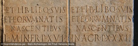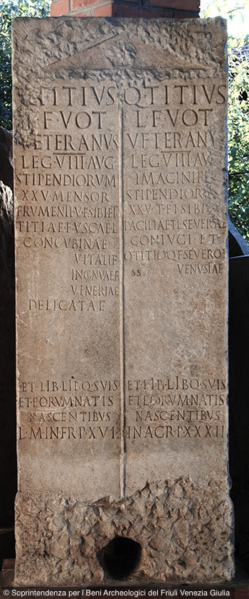 - L(ucius) Titius / L(uci) f(ilius) Vot(uria) / veteranus / leg(ionis) VIII Aug(ustae) / stipendiorum / XXV mensor / frumenti v(ivus) f(ecit) sibi et / Titiae Fuscae l(ibertae) / concubinae / Vitali f(ilio) / Ingenuae f(iliae) / Veneriae / delicatae / et lib(ertis) lib(ertabus)q(ue) suis / et eorum natis / nascentibus / l(ocus) m(onumenti) in fr(onte) p(edes) XVI // Q(uintus) Titius / L(uci) f(ilius) Vot(uria) / veteranus / leg(ionis) VIII Au[g(ustae)] / imaginife[r] / stipendioru[m] / XXV t(itulum?) f(ieri) i(ussit) sibi [et] / Paciliae T(iti) l(ibertae) Severae / coniugi et / Q(uinto) Titio Q(uinti) f(ilio) Severo f(ilio) / Venustae / et lib(ertis) lib(ertabus)q(ue) suis / et eorum natis / nascentibus / in agr(o) p(edes) XXXII