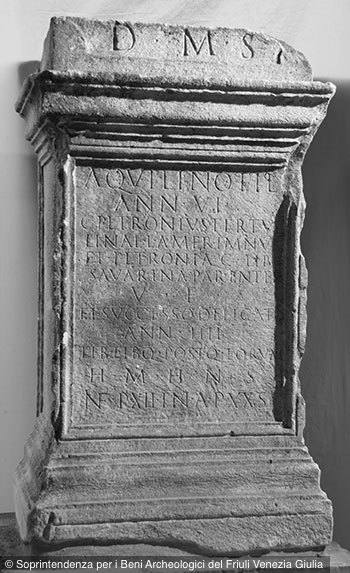 - D(is) M(anibus) s(acrum) // Aquilino fil(io) / ann(orum) VI / C(aius) Petronius Tertul/linae l(ibertus) Amerimnus / et Petronia C(ai) lib(erta) / Savarina parentes / v(ivi) f(ecerunt) / et Successo delicato / ann(orum) IIII / lib(ertis) lib(ertabus)q(ue) post(eris)q(ue) eorum / h(oc) m(onumentum) h(eredem) n(on) s(equetur) / in fr(onte) p(edes) XII in a(gro) p(edes) XX s(emissem)