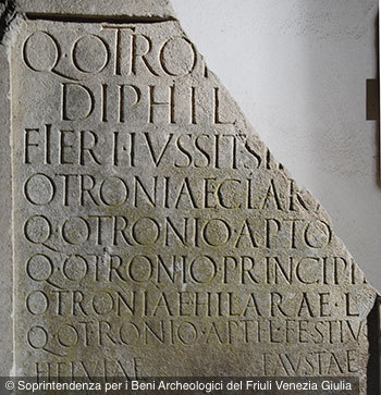 - Q(uintus) Otron[ius] / Diphil[us] / fieri iussit si[bi et] / Otroniae Clara[e] / Q(uinto) Otronio Apto / Q(uinto) Otronio Principi l(iberto) / Otroniae Hilarae l(ibertae) / Q(uinto) Otronio Apti l(iberto) Festivo / Helviae Faustae / l(ocus) m(onumenti) in fr(onte) p(edes) XVI / in agr(o) p(edes) XXXII