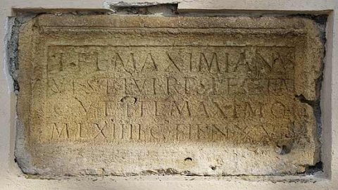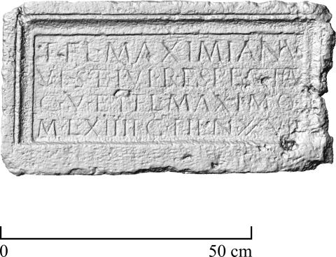 - T(itus) Fl(avius) Maximianus / v(ivus) f(ecit) s(ibi) et Iul(iae) Respectae / c(oniugi) v(ivae) et T(ito) Fl(avio) Maximo / m(iliti) l(egionis) XIIII G(eminae) fil(io) an(norum) XXVII