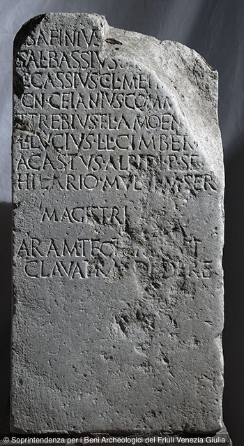 - L(ucius) Safinius [---] / Sal(vius) Bassius Sa[l(vi) l(ibertus) ---] / C(aius) Cassius C(ai) l(ibertus) Metr[odorus(?)] / Cn(aeus) Ceianius Comm[unis(?)] / T(itus) Trebius T(iti) l(ibertus) Amoen[us] / L(ucius) Lucius L(uci) l(ibertus) Cimber / Acastus Albidi P(ubli) ser(vus) / Hilario Mulvi M(arci) ser(vus) / aram tectam et / clavatra dedere
