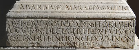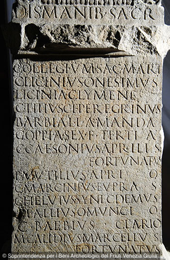 - D(is) M(anibus) sacr(atum) // collegium sacr(um) Mart(is) / C(aius) Licinius Onesimus / Licinia Clymene / C(aius) Titius C(ai) f(ilius) Peregrinus / Barbia L(uci) l(iberta) Amanda / Goppia Sex(ti) f(ilia) Tertia / C(aius) Caesonius Aprilis / Fortunatus / P(ublius) Mutilius Aprio / C(aius) Marcinius Eupras / C(aius) Helvius Synecdemus / L(ucius) Allius Omuncio / C(aius) Baebius Clario / M(arcus) Calidius Marcellus / Fortunatus // A(ulus) Barbius Zmaragdus medic(us) // quisquis collega debitor fuerit / loculo si decesserit sive vivos / recesserit in h<u=O>nc locum non / inferetur