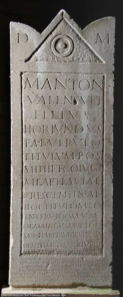 - D(is) M(anibus) / M(arcus) Anton(ius) / Valens vet(erani) / filius / {h}oriundus / Fab(ia) Veruto (Beryto !) / titulum pos(ui) / mihi et co(n)iugi / meae Flaviae / Crescentinae / hoc titulo meo / inserui domum / meam in qua multos / annos habitavi sicut testa/mento meo sanxi ut lib(ertis) / libertab(us)q(ue) meis posterisq(ue) eor(um) / qu<a=E>m reliquero ne veneat ne(ve) fi/ducietur ex qua reditus eius ut de(n)tur / decuriae meae XXV Maron(ianae) colleg(ii) fabr(um) XXXV / ad Parentalia XXII s(emissem) sicuti mihi et co(n)iugi meae / ponatis sic tamen ut decuria mea ut vinum quod accipim(us) / de Marciani in vic(o) provi(n)c(iali) IIII Idus Mai(as) ut / ad sepulc(hrum) meum profundatis mi(hi) et co(n)iugi me(ae) / et ipsi epulet(is) quod si non fecer(itis) <t=D>unc XXV dec(uria) / Apol(linaris) mi(hi) faciet