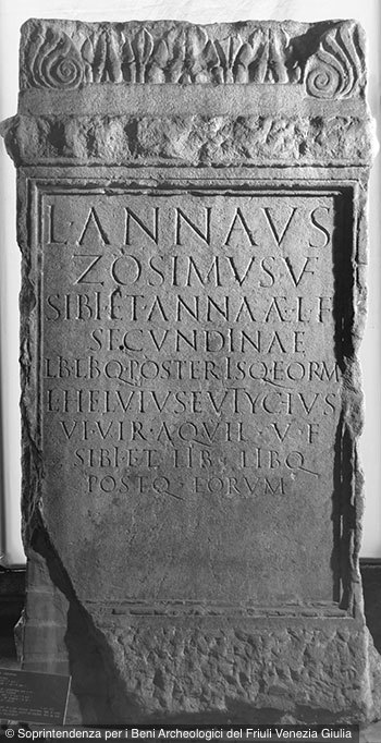 - L(ucius) Annaus / Zosimus v(ivus) f(ecit) / sibi et Annaa L(uci) f(iliae) / Secundinae / lib(ertis) lib(ertabus)q(ue) posterisq(ue) eor(um) / L(ucius) Helvius Eutycius / VIvir Aquil(eiae) v(ivus) f(ecit) / sibi et lib(ertis) lib(ertabus)q(ue) / post(eris)q(ue) eor(um)