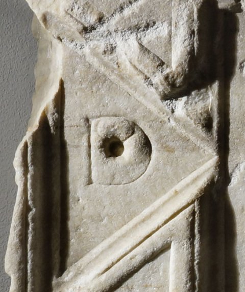 - Inschrift in tabula ansata mit Rosetten. Auf den Nebenseiten Blattornament, darunter zwei Fascien.