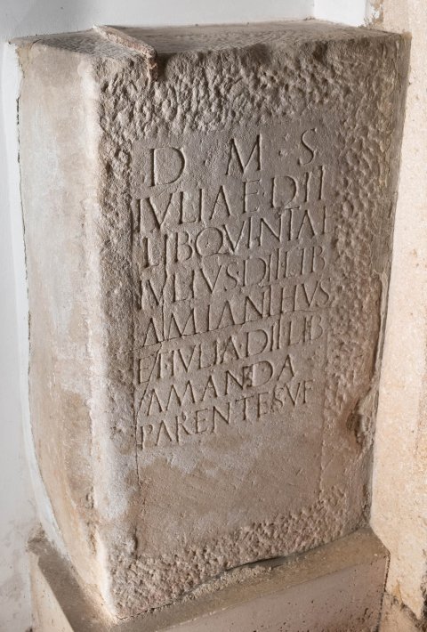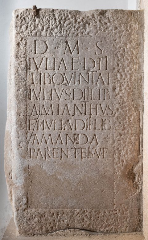 - D(is) M(anibus) s(acrum) / Iuliae Dii / lib(ertae) Quintae / Iulius Dii lib(ertus) / Amianthus / et Iulia Dii lib(erta) / Amanda / parentes v(ivi) f(ecerunt)