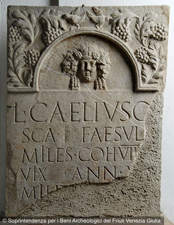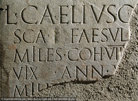 - L(ucius) Caelius Q(uinti) [f(ilius)] / Sca(ptia) Faesuli[s] / miles coh(ortis) VIII [pr(aetoriae)] / vix(it) ann(os) X[---] / milit(avit) [---