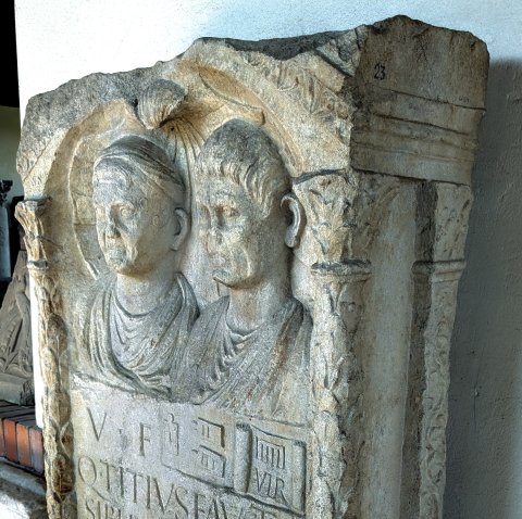 - Unter offenem Giebel, der von Säulen mit Blattdekor getragen wird, Muschelnische mit zwei Brustbildern (Ehepaar) in Tunica und Mantel (Frau mit Ohrschmuck und Halsreif, bartloser Mann in Toga ?). Im Schriftfeld oben Schreibtäfelchen und geöffnete Rolle (volumen). An den Kanten der Rückseite Rankenpilaster.