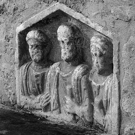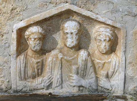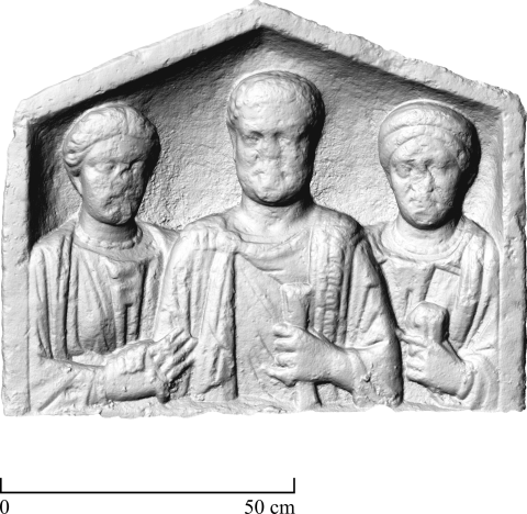 - In Bildfeld mit Giebel drei Brustbilder einer Familie. Links Frau: Tunica, Umhang, Halskette, Armreif. In der Mitte Mann: bärtig, Ärmeltunica, Sagum mit Fransen, Scheibenfibel, in der Linken Rolle (volumen). Rechts einheimische Frau: Haube, Umhang, Fibeln, Halsband.