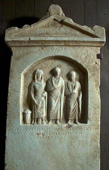 - In flacher ungerahmter Bogennische drei frontal stehende Ganzfiguren einer Familie: links Frau in Chiton und über den Kopf gezogenem Mantel. In der Mitte Mann im Mantel, rechts etwas kleinerer Mann. Neben der Frau hoher Behälter mit Deckel. Gerahmter Giebel mit Akroteren. Inschrift über und unter der Bildnische.