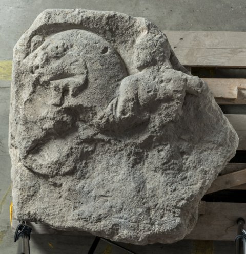 - Mythische Figur: Meerwesenfries, erhalten ist der Kopf eines Seepanthers und der Oberteil einer Nereide (Triton ?).