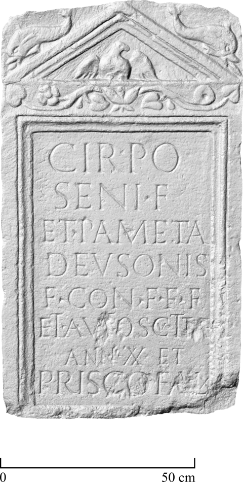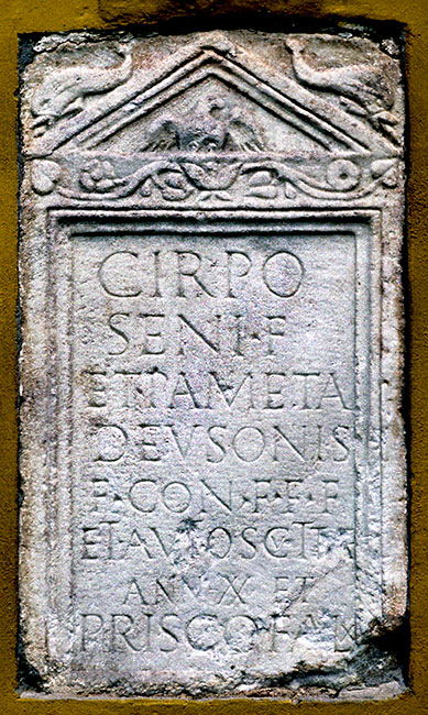 - Cirpo / Seni(i) f(ilius) / et Pameta / Deusonis / f(ilia) con(iux) f(iliis) f(iliabusque) / f(ecerunt) / et Autoscuttae / ann(orum) XX et / Prisco f(ilio) a(nnorum) LX