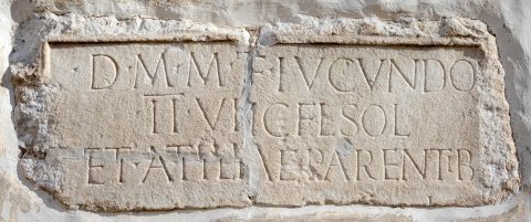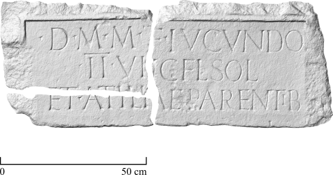 - D(is) M(anibus) M(arco) T[itio M(arci)? ] f(ilio) Iucundo / IIvi[r(o) iur(e) d]ic(undo) Fl(aviae) Sol(vae) / et Atili[ae ---]ae parentib(us) / [------]