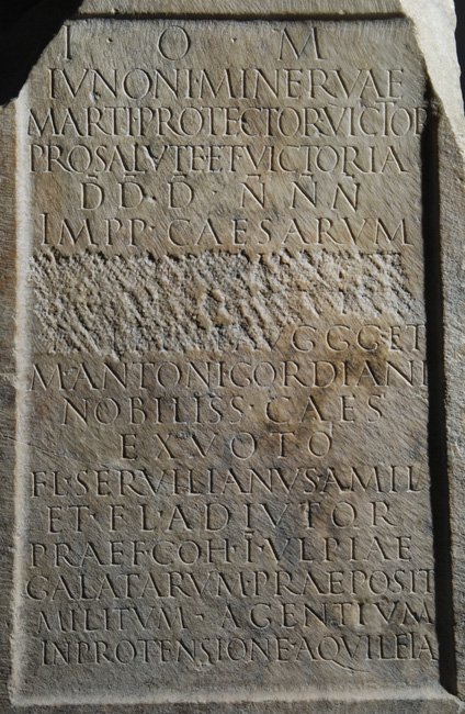 - I(ovi) O(ptimo) M(aximo) / Iunoni Minervae / Marti Protector(i) Victor(i) / pro salute et victoria / ddd(ominorum) nnn(ostrum) / Impp(eratorum) Caesarum / [[[M(arci) Clodi Pupieni]]] / [[[D(ecimi) Caeli Calvini]]] / [[[Balbini Au]]]ggg(ustorum!) et / M(arci) Antoni Gordiani / nobiliss(imi) Caes(aris) / ex voto / Fl(avius) Servilianus a mil(itiis) / et Fl(avius) Adiutor / praef(ectus) coh(ortis) I Ulpiae / Galatarum praeposit(i) / militum agentium / in protensione Aquileia(e)